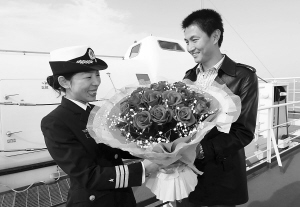 11月26日,女兵队副指导员夏卉(左)在“和平方舟”船上接受丈夫管启武的鲜花。当日,海军“和平方舟”号医院船圆满完成“和谐使命—2010”医疗服务,回到舟山某军港。 “和平方舟”号医院船于8月31日从浙江舟山起航,赴亚丁湾和吉布提、肯尼亚、坦桑尼亚、塞舌尔、孟加拉国等亚非五国开展人道主义医疗服务任务,为护航官兵和五国民众进行体检2127人,门诊诊治12806人,医疗巡诊1858人,辅助检查15537人次,手术97例。 新华社记者 查春明 摄
