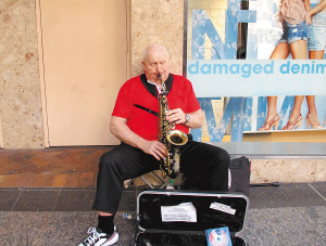繁华商业区里的步行街,人流滚滚,却并不匆忙。一个红衣老人坐在地上吹起了低沉的萨克斯,优雅而又专注,过客们或为之侧目,或驻足聆听。我也在此逗留了片刻,并在老人面前的盒子里丢了一枚澳币。