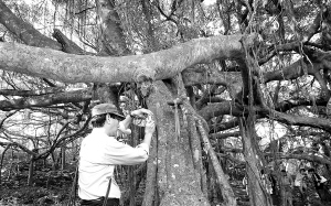 定安县翰林镇章塘村委会后岭村有棵百年古榕,独木成林。11月28日,参加生态人居国际论坛的一位专家看到后,上前拍照留念。