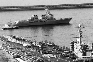 | 资料图片:7月25日,美国“乔治·华盛顿”号航母(下)和9200吨级的宙斯顿驱逐舰“麦克·坎贝尔”号(上)离开韩国釜山港前往韩国东部海域参加联合军演。 新华社/联合通讯社 |
