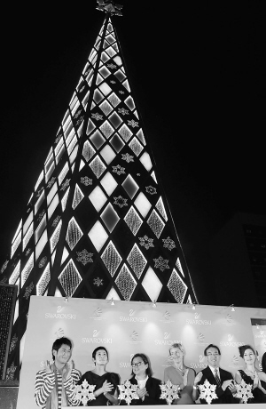 11月29日,李嘉欣(右一)、吴君如(左二)和古天乐(左一)等参加水晶圣诞树亮灯仪式。 当晚,安放在香港中环皇后像广场的一棵户外圣诞树举行亮灯仪式。这棵圣诞树高30米,采用200多万颗从奥地利进口的水晶。 新华社记者 宋振平 摄