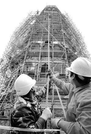 11月28日,苏州第二建筑工程公司职工在虎丘塔吊装脚手架材料。 近日,已有千余年历史的苏州虎丘塔迎来24年来首次全面“体检”,预计工期约一个月。 新华社发