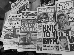 11月22日,关于政府求援的新闻成为爱尔兰各大报纸的头条。 新华社记者 曾毅 摄
