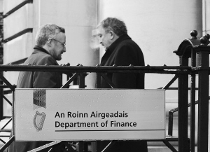 两名男子进出爱尔兰财政部。爱尔兰政府21日晚正式向欧盟和国际货币基金组织提出援助申请并获批。新华社发