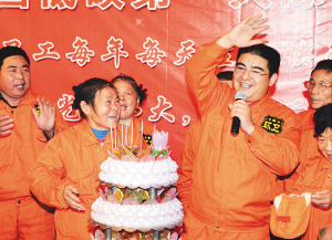 11月29日,陈光标(前右)为吴秀英(前左)唱生日歌。 当日,全国道德模范、被誉为“中国首善”的陈光标邀请南京秦淮区环卫所的50名环卫工人到他的公司,为环卫工人吴秀英过59周岁的生日。吴秀英20岁开始在南京市做一名环卫工人,至今已经39年。陈光标向这50名环卫工人每人赠送了1000元的慰问金,南京的一家服装企业也向每个人赠送了一件羽绒大衣。 新华社记者 孙参 摄