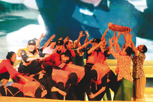 此外,南航官兵冒雨营救海南受灾群众的壮举也被搬上了舞台。舞蹈《风雨同舟》用视频和舞蹈相结合的手法,真实再现了军民鱼水一家亲的深厚情谊,精彩表演引起观众强烈共鸣,台下多次爆发出热烈掌声。晚会在阳刚大气的歌舞《使命如山》中落幕。