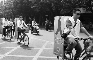 | 11月30日,20多名海南大学、海南师范大学等院校的青年志愿者,在海口街区的商场、高校、公园等地发放预防艾滋病手册,宣传艾滋防治知识。 本报记者 苏晓杰 摄