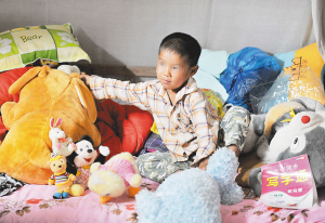 | 图为在广西柳州市城中区牛车坪村,小龙在玩好心人赠送的玩具。 新华社发 |