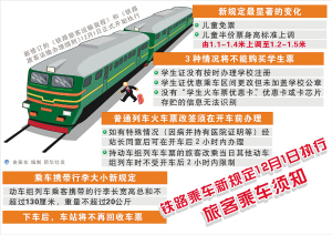 铁路新规定: 普通列车迟到 车票不可改签 11月30日,一辆动车组列车停靠在上海火车站。 12月1日,铁道部新修订的《铁路旅客运输规程》和《铁路旅客运输办理细则》正式实施。原规定中如果乘客没赶上列车,可以在开车后两小时之内办理改签。新规定实施后,普通列车的车票改签须在开车之前办理, 动车则不受此限制。 新华社发