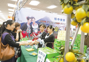 | 12月1日,在第六届泛珠三角省会城市市长论坛展暨2010第八届中国(海口)国际旅游商品交易会上,琼中黎族姑娘给游客们送上香甜的绿橙。 本报记者 王凯 摄 |