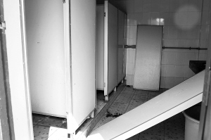 厕所的3个厕位,一个门紧锁,另外两个门坏掉,其中一门板就放在厕位旁,人进去就没有转身余地。厕所便槽里满是黄色污渍,没有纸篓,用过的厕纸就随意扔在地上。