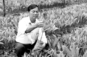 | 11月24日,符育壮在自家槟榔苗圃里忙碌着。 本报记者 苏晓杰 摄 |
