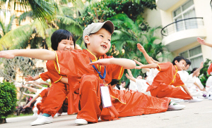 今天下午,在山东省烟台市武术馆馆长谌中立、三亚市大学生武术协会总顾问司品辉的带领下,50名吉尔吉斯斯坦儿童穿上一身或红、或白的练功服,扎马步、打长拳,然后一个“扫荡腿”,口中还有模有样地喊着“吼嗨吼嗨”口号声,围观的人们纷纷拍手为他们叫好。
