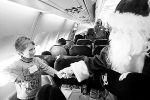 12月1日,“圣诞老人”在飞机上与一名病童握手。 当日,200多名身患重症的加拿大儿童从温哥华国际机场出发,飞往北极上空迎接“圣诞老人”。这是“加拿大儿童梦想基金会”主办的活动,旨在让因长期生病而从未能与家人共同旅行的儿童实现乘坐飞机的梦想,同时让他们充分感受圣诞节的快乐气氛。 新华社发