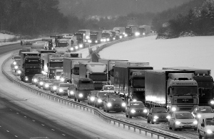 | 12月1日,在英国南部肯特郡一条积雪的公路上,交通发生拥堵。