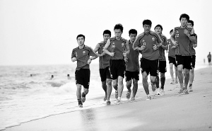 高洪波说:“海南的沙滩十分松软,在沙滩上跑步对队员肌肉力量的增长很有帮助,是一个很好的训练方式。”
