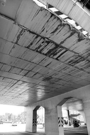 | 被过往超高大货车撞得伤痕累累的海口和平桥。