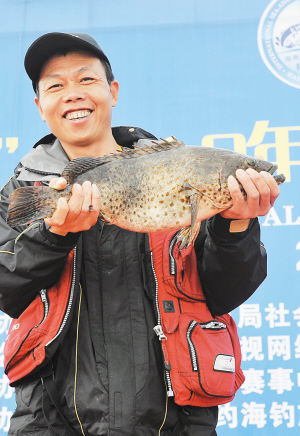 最好的留在最后,3时50分,编号为11号的船最后一个靠岸,船上选手得意地举着一条大鱼。经称重,这条青斑鱼重2.81公斤,是今天所有参赛选手钓到的最大的一条鱼。不过,这条鱼比昨天周建全钓到的将近10斤的大鱼还有不小的差距。周建全也凭着昨天的意外之喜,获得船钓第一名(奖金15000元)和船钓单尾重量第一名(奖金2000元),共收获17000元奖金。获得矶钓第一名(奖金15000元)和矶钓单尾重量第一名(奖金2000元)的徐文进也收获奖金17000元。