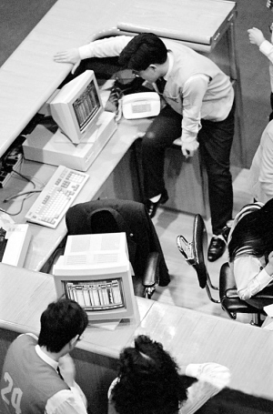 | 一九九零年十二月中旬,位于上海黄浦路十五号浦江饭店(原理查饭店)内的上海证券交易所正式开业。 新华社资料图片 |