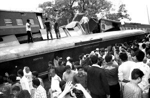 12月8日,在孟加拉国首都达卡东北约30公里处,救援人员在列车相撞现场工作。两辆客运火车当天在离首都达卡不远处的一个火车站相撞,造成至少7人死亡。 新华社/法新