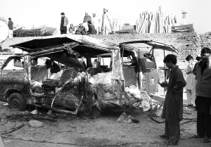 12月8日,在巴基斯坦西北部科哈特市发生爆炸袭击的市集附近,人们查看一辆被炸毁的小巴士。巴基斯坦西北部科哈特市一集市当日发生一起自杀式爆炸袭击,造成15人死亡、20多人受伤。 新华社/路透