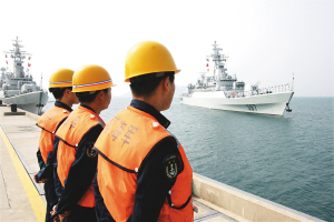 | ←护卫舰驶入三亚某军港,战友们在码头迎接。