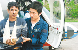 | 手指受伤的工人被接到三亚救治。 通讯员 唐帅 摄 |