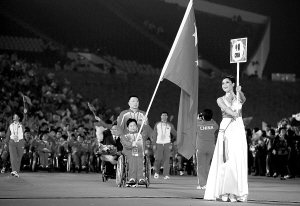 中国体育代表团最后入场。北京残奥会冠军、轮椅击剑选手胡道亮手持鲜艳的五星红旗,走在队伍最前列。中国体育代表团共614人,其中运动员431人。本次代表团是我国自1982年首次参加亚残运会前身远东及南太平洋地区残疾人运动会、1984年参加纽约残奥会以来规模最大的残疾人体育代表团,也是广州亚残运会规模最大的代表团。