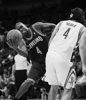 | 北京时间12月12日,在NBA常规赛中,火箭队主场以110:95战胜骑士队。图为斯科拉(右)防守骑士队球员贾米森(左)。 新华社发 |