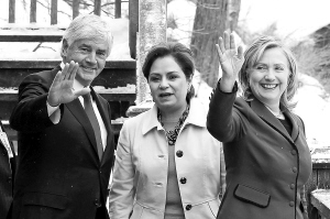 12月13日,在加拿大魁北克省韦克菲尔德,加拿大外长劳伦斯·坎农(左)、美国国务卿希拉里·克林顿(右)和墨西哥外长埃斯皮诺萨出席北美三国外长会议。 为期半天的北美外长会议当日在这里举行。加拿大外长劳伦斯·坎农、美国国务卿希拉里·克林顿和墨西哥外长埃斯皮诺萨重申加强三边合作和协调,并为预定明年召开的北美领导人峰会做准备。 新华社发