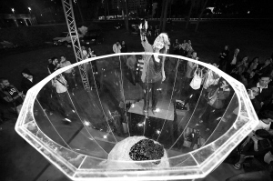| ↑ 2010年10月29日,在黎巴嫩贝鲁特,一女子向巨型酒杯中倒入红酒。当日,这只2.4米长,1.65米宽的巨型酒杯被吉尼斯机构认定是世界上最大的酒杯。 |