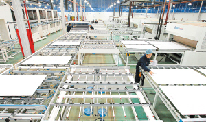 | 海南英利新能源有限公司一名技术工人在组件车间检查产品质量。