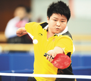 | 12月15日,广州2010亚残运会乒乓球比赛在亚运城体育馆内继续进行。中国选手胡二广在比赛中。他在男子单打TT10组1/4决赛中以1:3不敌对手,无缘下一轮。 新华社发 |