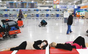 12月15日,几名乘客滞留在希腊雅典国际机场。从13日开始,希腊的公交系统、医疗卫生系统员工进行连续5天的罢工行动,连续几天的公交停运导致雅典市中心交通拥堵,市民出行非常不便。 新华社/法新