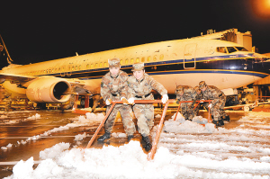 部队官兵连夜驰援 12月16日凌晨,驻浙武警及预备役部队官兵在杭州萧山国际机场铲雪。 12月15日,受大雪影响,杭州萧山国际机场一度关闭,全天共有98个进出港航班延误,171架次取消,滞留旅客8000多人。经过部队官兵连夜紧急除雪,至16日上午8时,暂时关闭的萧山机场重新开放。 新华社发(梁臻 摄)