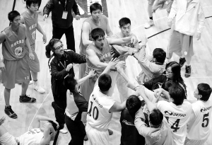 12月16日,第十八届香港工商杯国际篮球邀请赛在香港举行,在小组赛中,中国广东新丽宝队以81:56战胜泰国队。 图为中国广东新丽宝队球员与泰国队球员在比赛中相互推搡。 新华社发