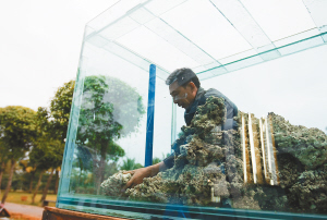 工人在巨大的鱼缸内布设“海底世界”。