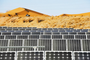 位于宁夏中卫市腾格里沙漠边缘的金阳新能源一期30兆瓦光伏电站建设工地(12月14日摄)。 宁夏中卫市依托沙漠日照充足,地域广阔的优势,在腾格里沙漠边缘发展光伏产业,引进太阳能组建制造、设备生产、光伏电站等企业,形成完整的光伏产业链,打造沙漠里的“太阳能硅谷”。 新华社记者王鹏摄