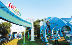 | 17日,在2010体博会的海南国际旅游岛主题展区里,工人正在进行最后的调整。