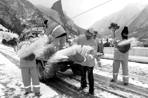 ↑ 12月16日,福建省武夷山市公路局的工作人员在用工业盐清除路面结冰。12月15日晚,福建武夷山受强冷空气影响,降下今冬首场大雪,省道303线分水关路段因冰雪导致车辆行人无法通行。