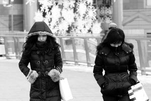 ↑ 12月16日,两名行人顶着寒风经过陆家嘴街头。 受北方强冷空气影响,当日上海市区最低气温降至零下2摄氏度,郊区为零下3-零下5摄氏度,部分地区有冰冻。