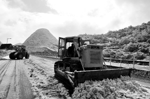↑ 12月16日,大型机械在京港澳高速韶关乳源大桥至乐昌梅花路段进行除冰作业。受强冷空气南下影响,广东北部山区气温降至零下,境内的京港澳高速乳源段和坪乳公路路面结冰,交通从12月16日凌晨开始中断,大量车辆滞留。