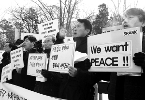 | 12月17日,当地市民在韩国首尔国防部门口举行抗议活动。当日,部分韩国市民在首尔举行示威,抗议韩国在延坪岛举行实弹射击训练。韩国军方宣布,将于本月18日至21日期间的某一天在延坪岛海域举行海上实弹射击训练。 新华社发(朴真熙摄) |