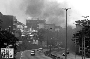 12月17日,科特迪瓦首都阿比让的街区冒着滚滚浓烟。 科特迪瓦共和人士联盟党主席、前总理瓦塔拉支持者16日上午举行游行向国家电视台聚集,遭到前总统巴博政府警察驱散。联合国驻科特迪瓦行动团14日晚发布公报说,支持瓦塔拉的反对派联盟将于16日和17日组织游行,以支持瓦塔拉进驻国家电视台和总理府。 新华社/路透
