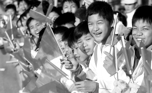 | 12月18日,儋州学生为参加马拉松赛的选手摇旗助威。 本报记者 李英挺 摄 |