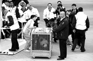 | 12月18日,赠澳大熊猫乘专机抵达澳门国际机场。 新华社记者 张金加 摄 |