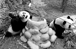 | 大熊猫“开开”(右)和“心心”正在享用麻竹。新华社记者 张金加 摄 |