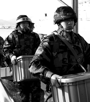 | 12月18日,在韩国延坪岛港口,韩国海军陆战队员搬运物资。