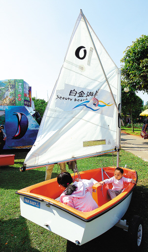 | 18日,在体博会海南国际旅游岛展区内,小朋友在帆船内玩耍。 本报记者 宋国强 摄 |
