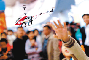 | 在体博会展览馆里,航模吸引观众眼球。 本报记者 张杰 摄 |